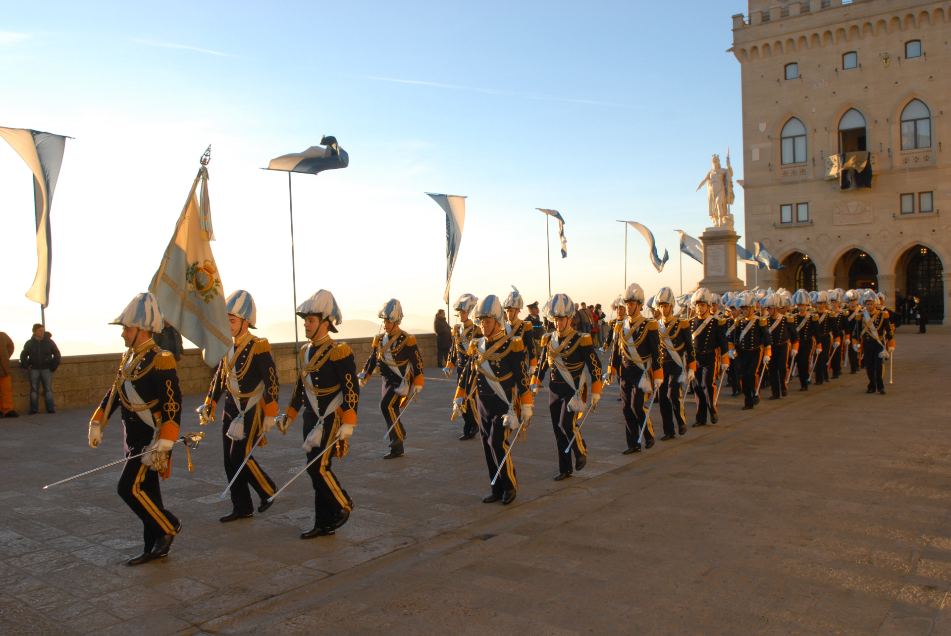 Il nostro servizio, svolto con la massima dedizione e rigore, è duplice. Da un lato, garantiamo con solennità la sicurezza e il decoro delle massime cariche dello Stato, in primis gli Eccellentissimi Capitani Reggenti e l’Aula del Consiglio Grande e Generale, di cui portiamo il nome con fierezza. Dall’altro, siamo i primi rappresentanti formali della Repubblica in ogni cerimonia e evento. Ogni nostra uniforme, ogni gesto e ogni onore reso non è che la manifestazione tangibile della sovranità e del valore morale della nostra Nazione. In questo, risiede la nostra più alta responsabilità: servire l’Istituzione con disciplina, onore e senso del dovere, in ogni circostanza.
